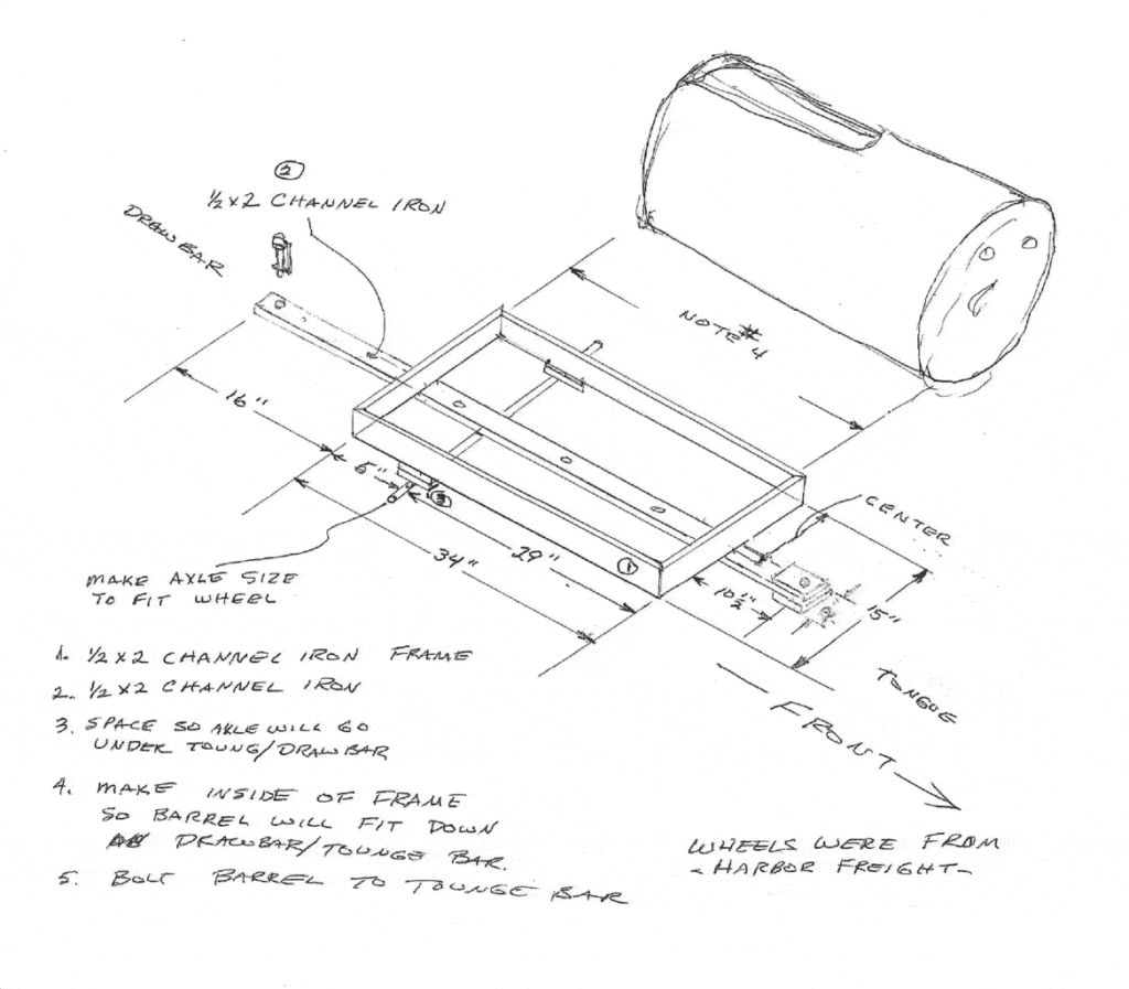 - The length of the tongue and drawbar, and weight distribution are important on the way the cart trails and turns. (Pictures of a barrel car with dimensions will be added later)